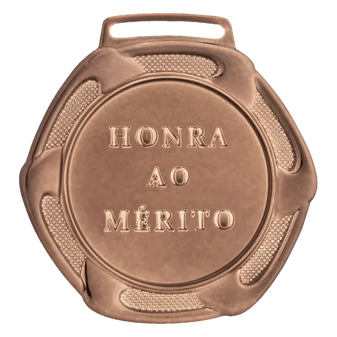 A medalha possui acabamento metalizado em dourado, conferindo uma aparência nobre e requintada. Além disso, conta com um suporte integrado para fita, com 2,5 cm de largura, permitindo fácil aplicação de fitas de diversos estilos. Como complemento opcional, o produto pode ser fornecido com uma fita de cetim azul, também com 2,5 cm de largura, garantindo um visual refinado e adequado para diversas ocasiões de destaque.